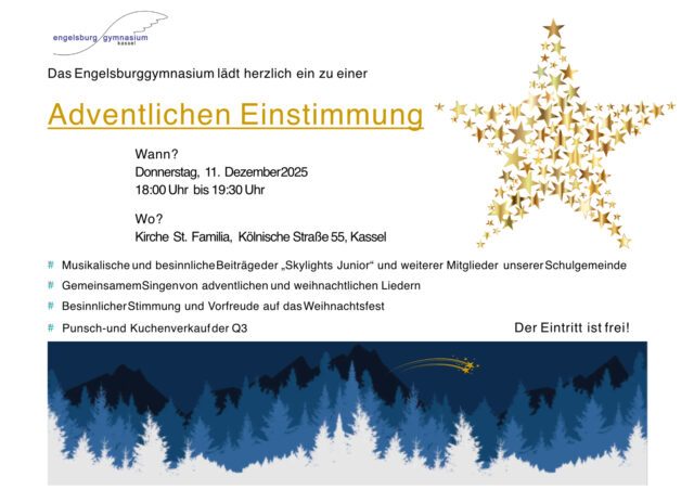 Das Engelsburggymnasium in Kassel lädt alle herzlich zu einer besonderen adventlichen Einstimmung am Donnerstag, den 11. Dezember 2025, ein. Von 18:00 Uhr bis 19:30 Uhr wird in der Kirche St. Familia, Kölner Straße 55 in Kassel, ein vielfältiges Programm geboten, das musikalische und besinnliche Beiträge beinhaltet. Die Skylights Juniors sowie weitere Mitglieder der Schulgemeinde gestalten diesen festlichen Abend mit weihnachtlichen Klängen und Darbietungen.