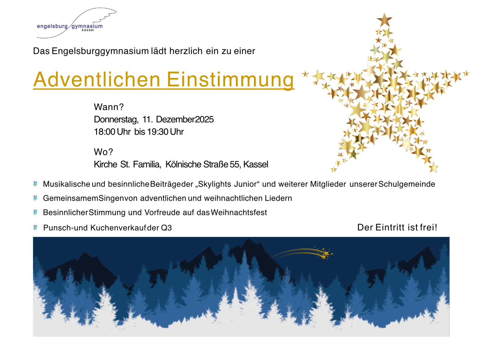 Das Engelsburggymnasium in Kassel lädt alle herzlich zu einer besonderen adventlichen Einstimmung am Donnerstag, den 11. Dezember 2025, ein. Von 18:00 Uhr bis 19:30 Uhr wird in der Kirche St. Familia, Kölner Straße 55 in Kassel, ein vielfältiges Programm geboten, das musikalische und besinnliche Beiträge beinhaltet. Die Skylights Juniors sowie weitere Mitglieder der Schulgemeinde gestalten diesen festlichen Abend mit weihnachtlichen Klängen und Darbietungen.