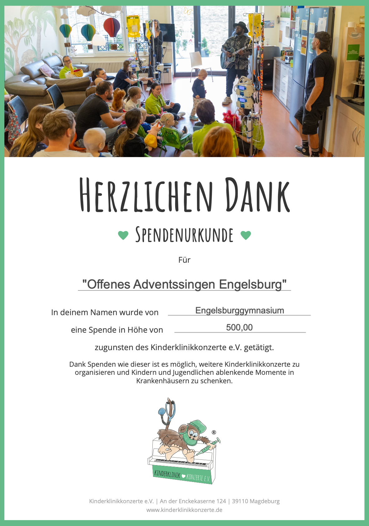 Dank der großen Spendenbereitschaft der Teilnehmenden konnten 500 Euro an das Projekt Kinderklinikkonzerte überreicht werden. Der Verein organisiert Musikveranstaltungen für Langzeitpatientinnen und -patienten in Kliniken, insbesondere in der Kinderonkologie – eine wunderbare Gelegenheit, Freude und Hoffnung zu schenken.